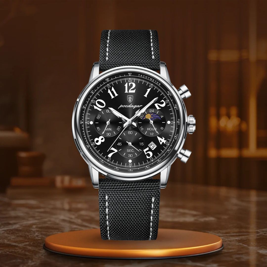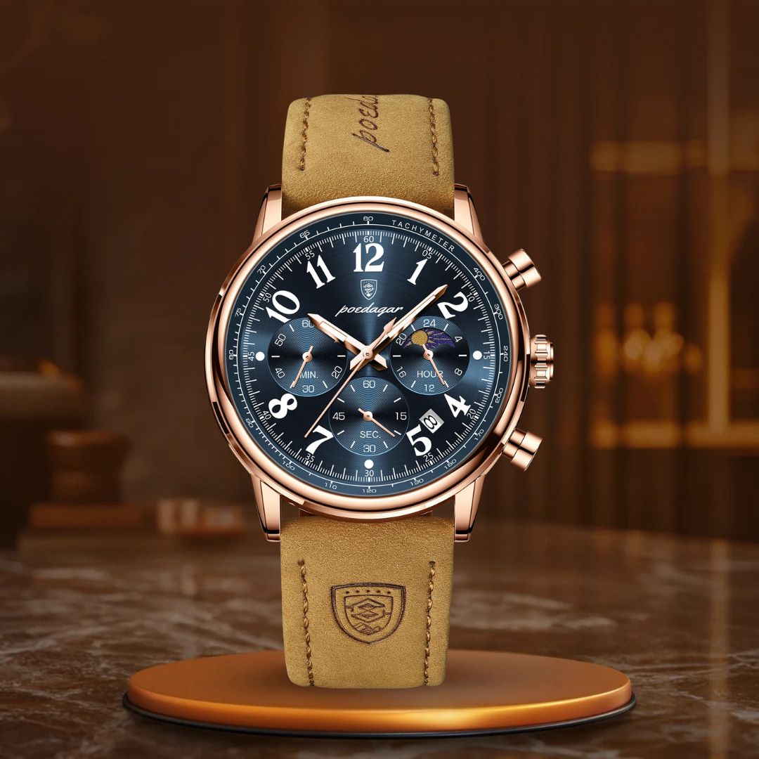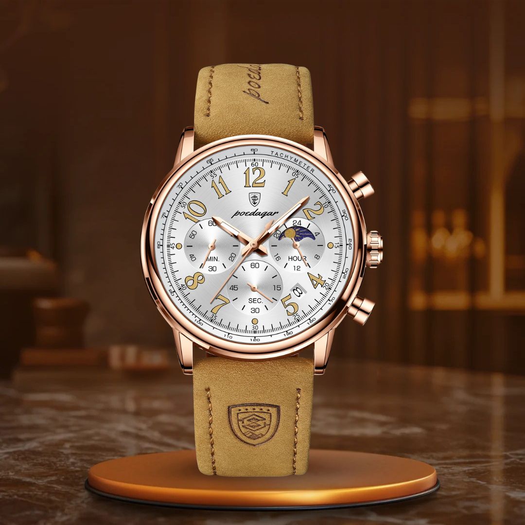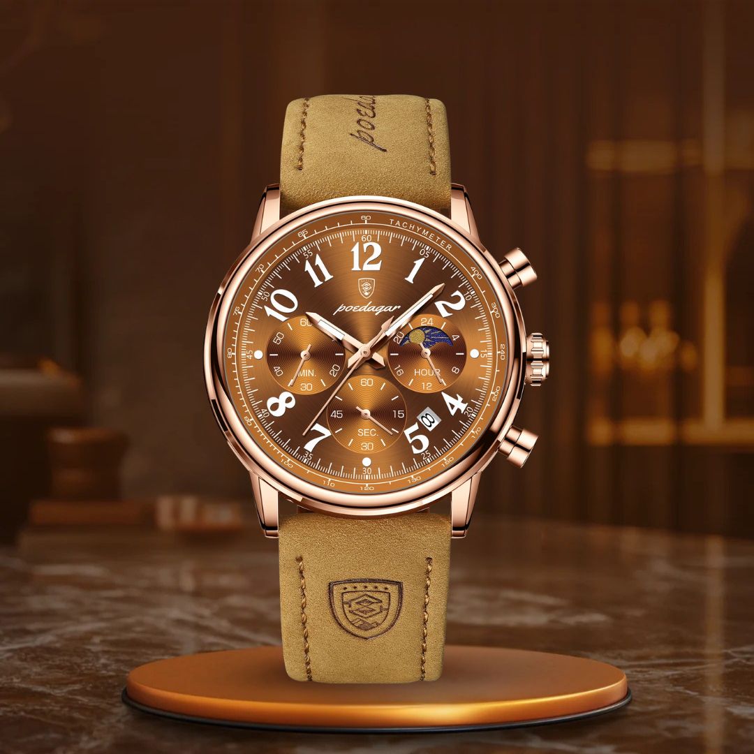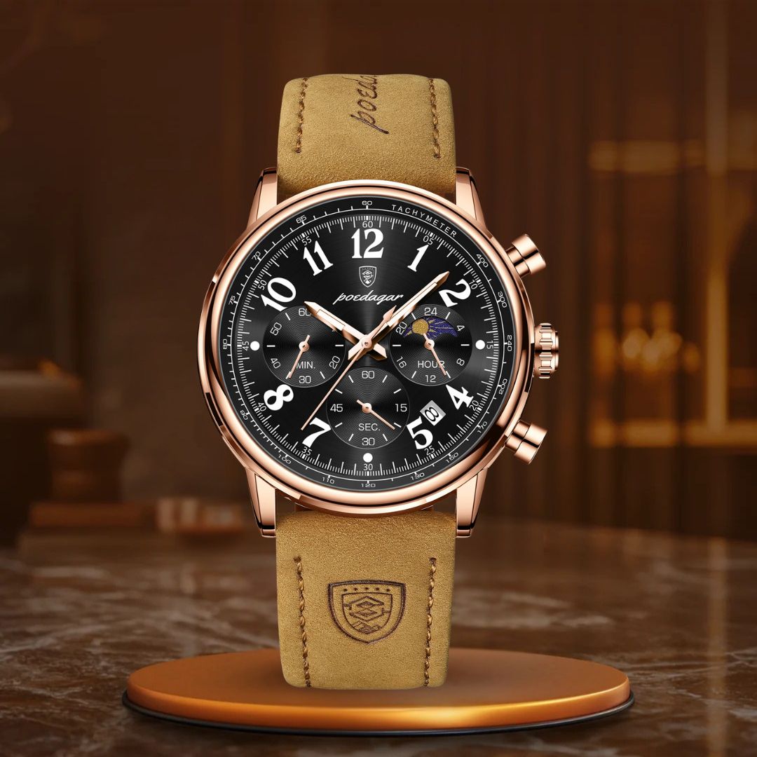 O relógio cronógrafo de luxo é o complemento ideal para aprimorar qualquer look. Com sua sofisticada bracelete de couro e design elegante de cronógrafo, este relógio não apenas impressiona pelo visual – ele também entrega desempenho excepcional. Seu mostrador luminescente permite que você veja a hora com facilidade em ambientes com pouca luz, enquanto o movimento de quartzo de alta precisão assegura que você esteja sempre pontual, não importa onde a vida o leve.